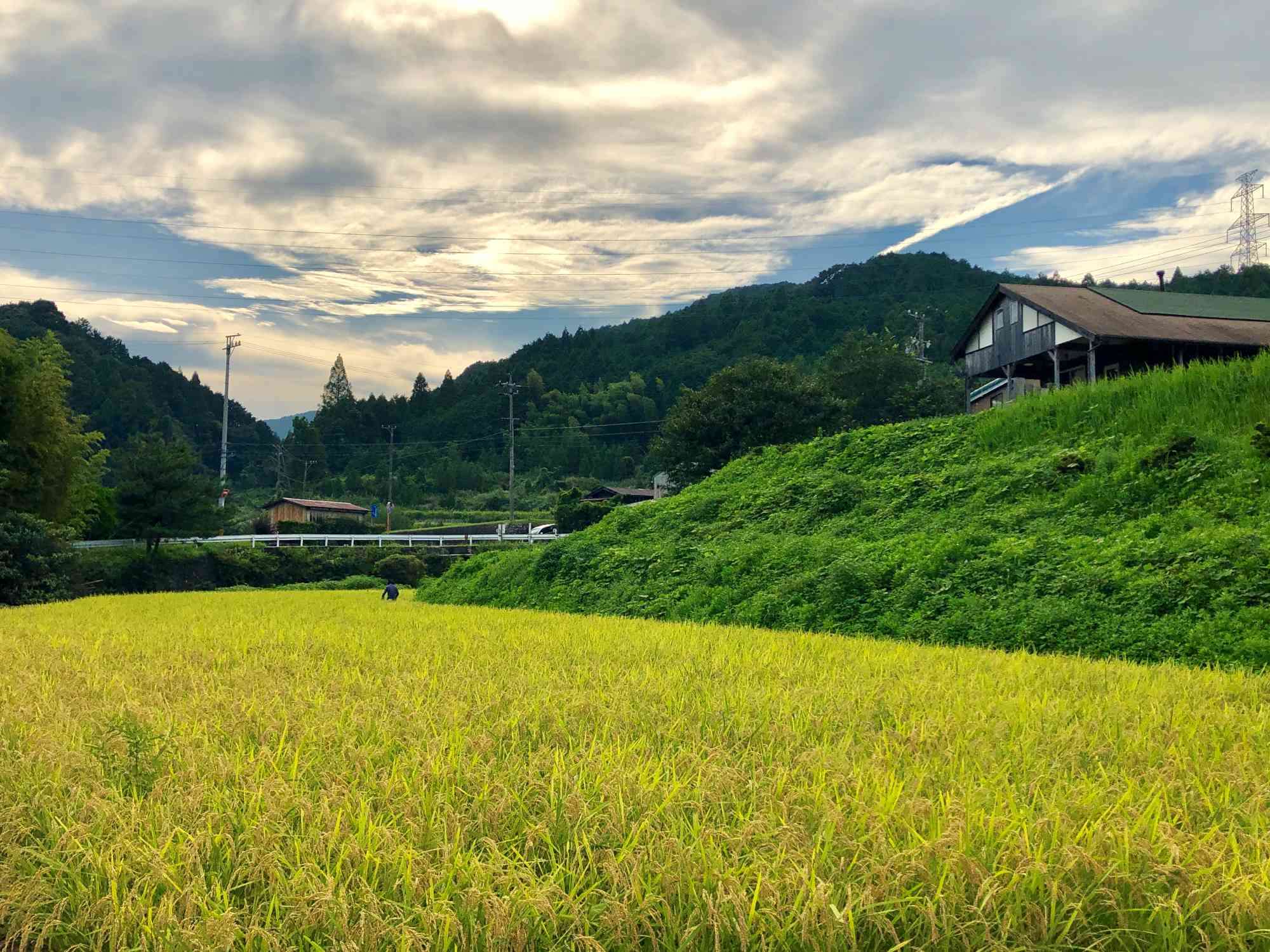 太陽の沈む山の中腹あたりにある小さな小さなみんなの隠れ家。写真の田んぼの上のお家が「えんがわ」です。